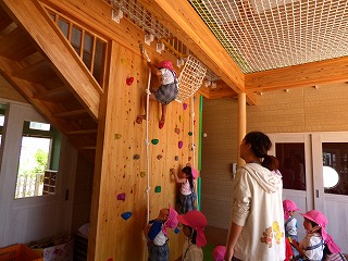 《 全天候型遊戯スペース 》 雨の日も、思いきり遊べるスペースです。 いっぱい身体を動かして、元気な身体をつくります。 |