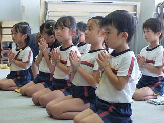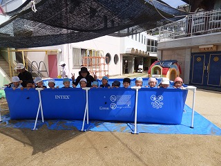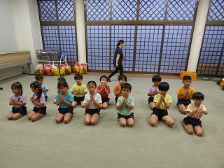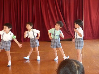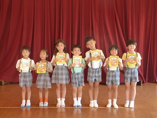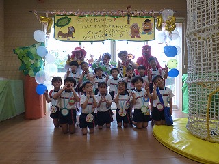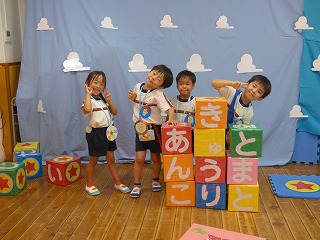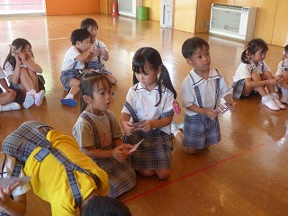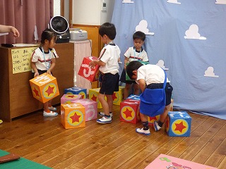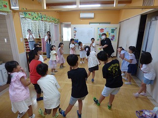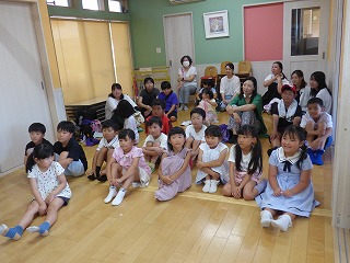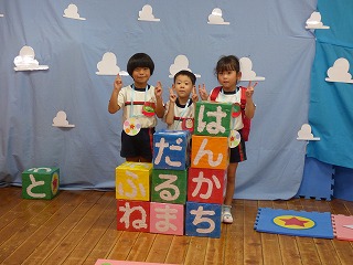 | 大型絵本「にじいろのさかな」とっても深いお話でしたがみんな集中して真剣に聞き入っていました。 | みんなでお祝いのダンス |