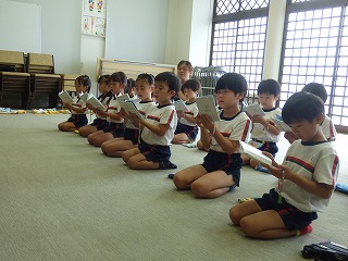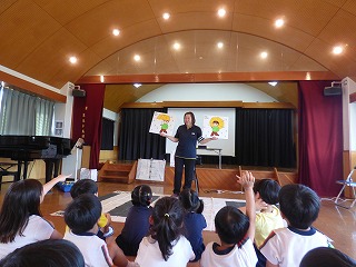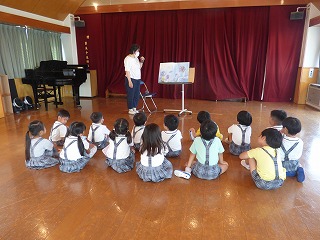 懐かしの「おたまじゃくしの101っちゃん」を 先生に読んでもらいました。しっかり聞けたかな? |