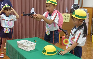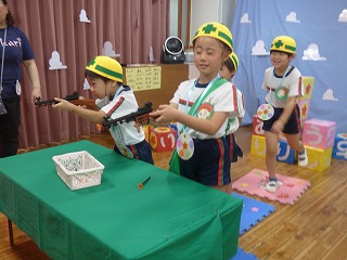 最初のミッションはウッディルーム! まずは先生のクイズの答えをみんなで作ったお名前BOXの中から探して組み立てました。 答えは分かっていてもなかなか文字が見つからず グループのみんなで力を合わせて探しました☆ その後はロッツオの仲間たちを射的で倒します! 安全のためにヘルメットをかぶって・・・♡ 狙いを定めて撃ち当ててミッションクリアー! |