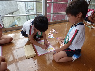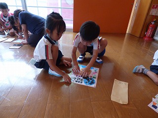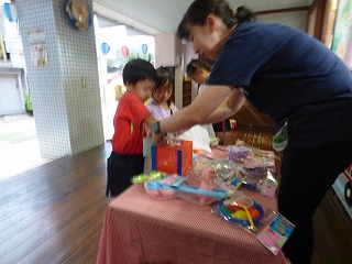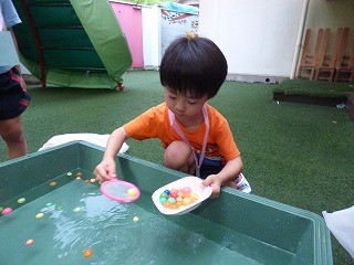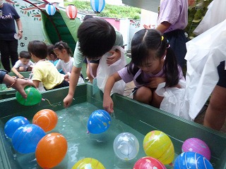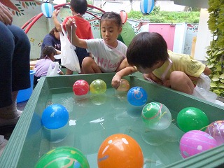 夏祭り後半はペアさんと出店へgo! くじ引きで景品をゲットしたり 気に入った水風船を釣ったり♪ ボールすくいでは何個穫れるか挑戦! 30個以上穫った子もいて先生達もびっくり!! |