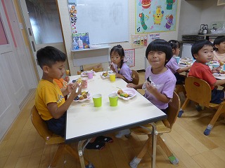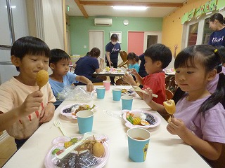 ミッションをクリアした後はみんなでかき氷を食べて その後にはお弁当も! お昼ご飯ではなく晩ご飯をみんなと一緒に食べるのは いつもと違ってなんだか変な感じ♪ ひかり菜園で収穫した枝豆も一緒にいただきました♡