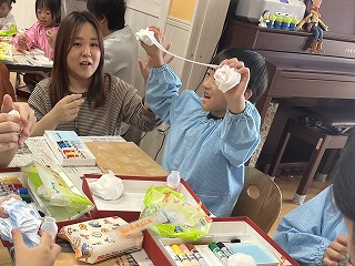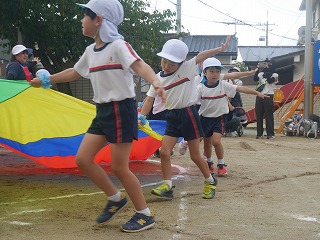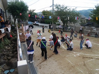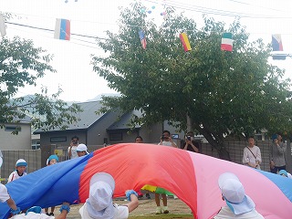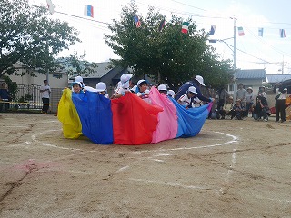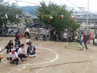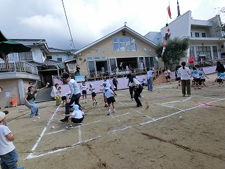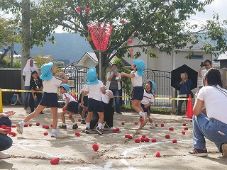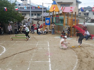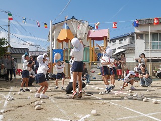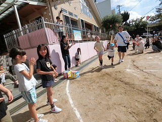 親子競技1種目目は玉入れ。 グループ保育のチームに分かれて対戦しました! リハーサルまでの子どもたちの成績は五分五分。 そしておうちの人も加わった当日も良い戦いに! 3回戦して今回はYチームが勝ちました☆ |