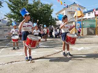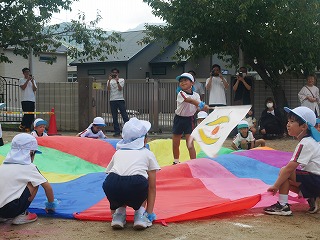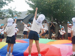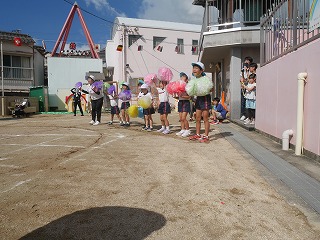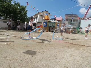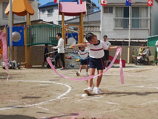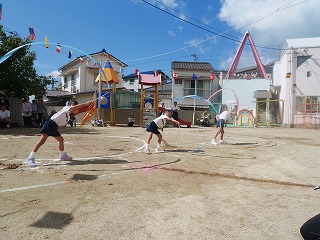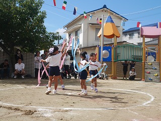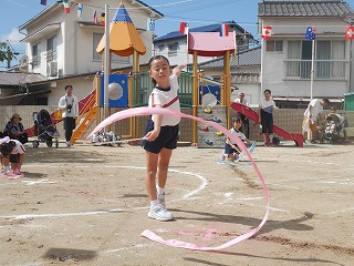 女の子たちがずっと憧れていて練習も 意欲的に取り組んできたリボン体操。 アナ雪の『♫生まれてはじめて♫』に合わせて 披露する姿はとってもかわいくキレイでした☆ 演技が終わって退場した時の女の子たちは みんなやりきった!と言わんばかりの笑顔でした! |