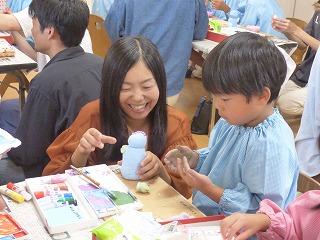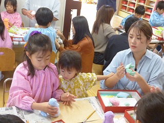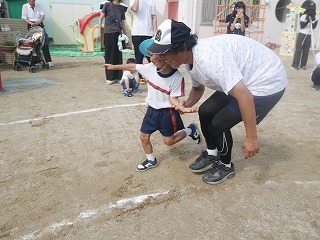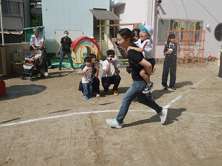 親子競技2種目目は借り物競走の人バージョン、 「ちょいと一緒に来てくださ~い!」 これもグループ保育のチームに分かれて対決しました! サイコロを転がして出た【だっこ】【おんぶ】【ほっぺ】の指示に従っておうちの人とヨイショヨイショ♪ ?BOXからお題を1つ引いて・・・ 【めがねの人】【時計をつけてる人】など当てはまる人を 会場の中から探して一緒にダッシュ! 今回はKチームの勝利‼ |
