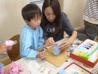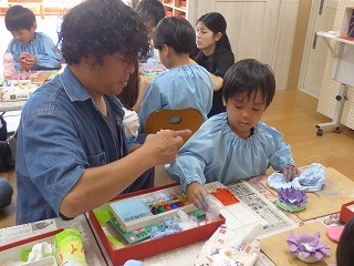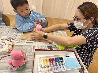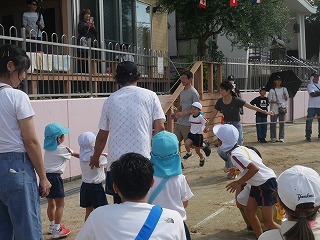 Kチーム・Yチーム、そして先生のTチームの お父さんお母さんに分かれての障害物競走リレー! 「お父さん頑張ってー!」「ママ勝ってよー!」と 子どもたちに応援される中白熱した戦いが‼ アンカーのマスクマンに子どもたちも大喜びでした★ |