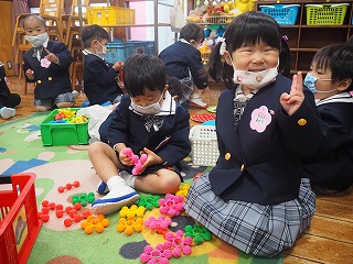 登園してくると天気の良い日には園庭で、 天気の悪い日にはお部屋で遊びます。ひかり 幼稚園の子どもたちは、同じクラスのお友達 だけではなく、他のクラスのお友達ともたくさ ん遊びます。
